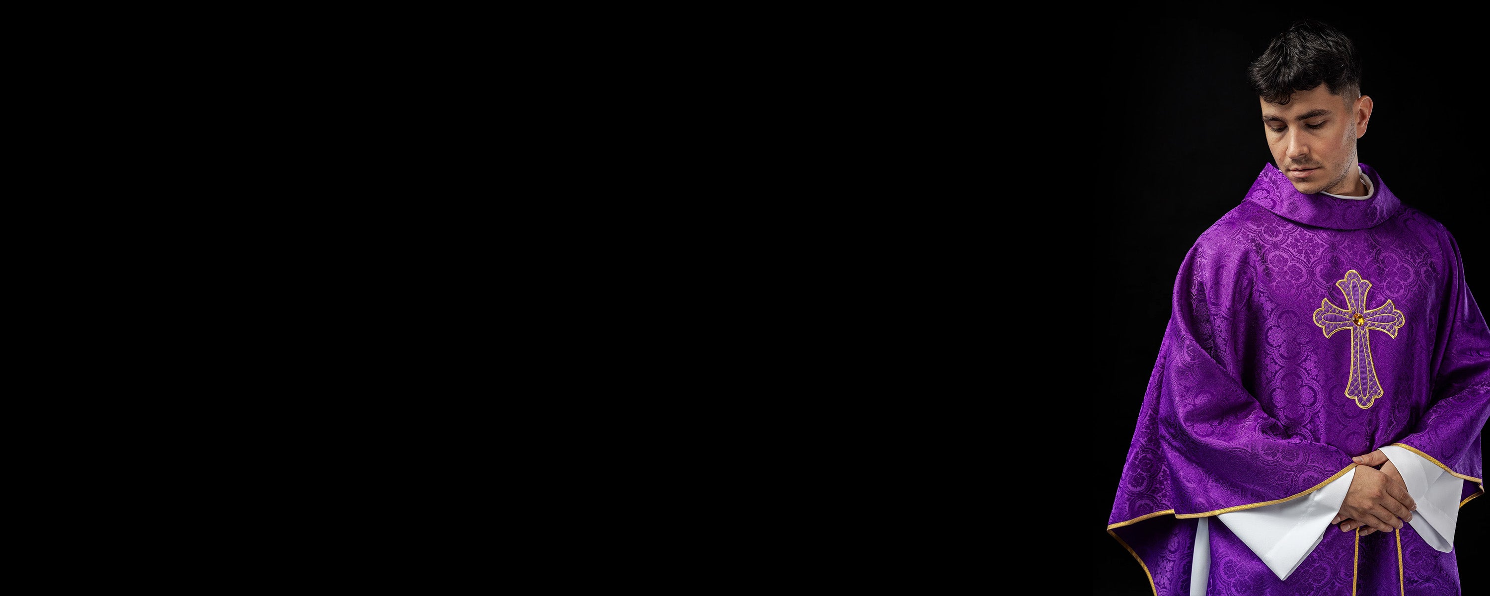Chasuble violette avec bande brodée et motif de croix