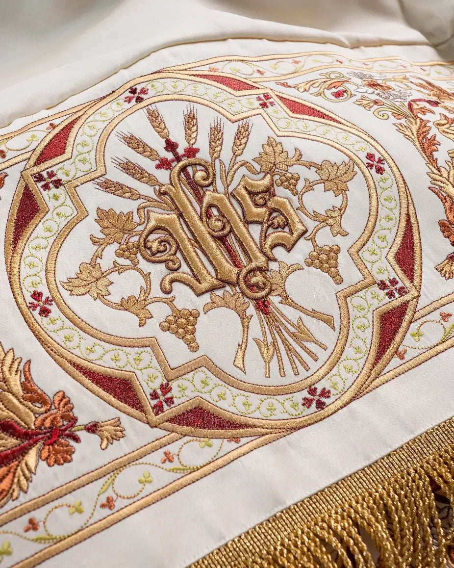 Cape liturgique rouge avec IHS doré